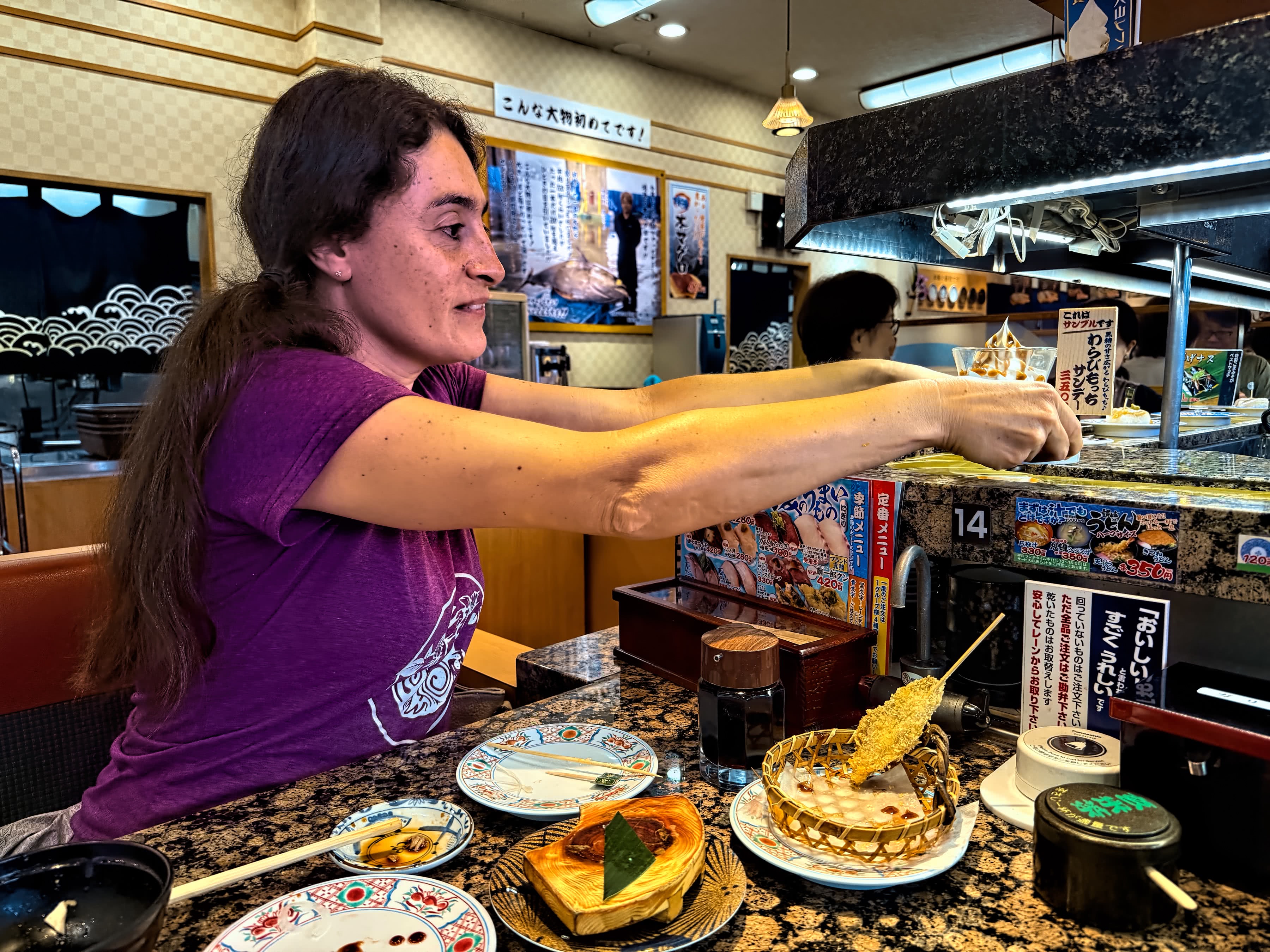 Hokkaido Sushi selfie :)Hokkaido Sushi EntranceWaiting area when you walk inConveyor BeltPanko veggiesSushi!More SushiMaria grabbing a dessert orderIncredibly good softserve dessert